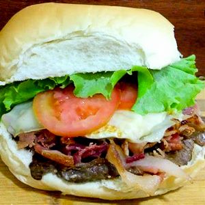 Pão bola, filé de alcatra, filé de frango, bacon, calabresa, ovo, queijo, presunto, tomate, alface, maionese e ketchup